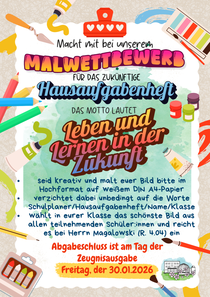 Auch dieses Schuljahr rufen wir alle Schüler:innen unserer Schule auf, bei unserem Malwettbewerb für das Cover den zukünftigen Hausaufgabenheftes mitzumachen. Das Motto lautet diesmal: „Leben und Lernen in der Zukunft“. Wichtig ist dabei, dass die Bilder auf weißem DIN A4-Papier im Hochformat gemalt werden sollen und das bitte keine Schriftzüge mit Bezug auf das Hausaufgabenheft, sowie Name/Klasse aufgemalt werden. Diese werden erst später digital auf das Motiv aufgebracht.